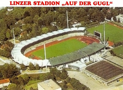 Das Bild zeigt das Linzer Stadion „Auf der Gugl„, welches per 28. Juni 1952 eröffnet und im Laufe der Jahre mehr und mehr adaptiert wurde. Ebenso im Bild die 1974 eröffnete Stadt- und Sporthalle der Stadt Linz. Die Aufnahme stammt von 1994.