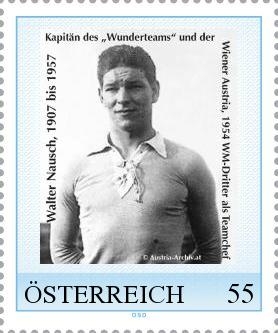 Auch bei dieser Briefmarke dreht es sich um einen großen österreichischen Fußball-Spieler längst vergangener Tage. Walter Nausch, genannt ,Sir´, war nicht nur der Kapitän des legendären Fußball-Wunderteams unter Feldherr Hugo Meisl, er war auch selbst Teamchef beim letzten großen Erfolg einer österreichischen Nationalmannschaft 1954 in der Schweiz. Österreich belegte damals den 3. Platz bei der WM. Unvergessen ist der 7 : 5-Sieg gegen das Veranstalterland Schweiz, welches bis heute noch als das torreichste Spiel bei einer Fußball-WM gewertet wird. Walter Nausch gewann als Aktiver zweimal den Mitropacup (heutige Champions-League) und lebte von 1907 bis 1957. Aktiv war er für ,seine´ Wiener Austria, als auch für den WAC. Er fand am Ottakringer Friedhof in Wien XVI seine letzte Ruhe.