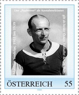 Diese Briefmarke soll an den wohl größten Fußballer Österreichs aller Zeiten erinnern. Matthias Sindelar, der im Volksmund als ,Der Papierene´ galt ob seines schnörkellosen und beinahe schon leichtfüßigen Spiels, gehörte als Ausnahmekönner seines Faches dem Wunderteam der 30iger Jahre an und bereitete der Österreichischen Nation in dieser Zeit viele unvergessliche Momente auf der Hohen Warte und im Wiener Stadion. Matthias Sindelar (1903 bis 1939) lebte nach dem Ende seiner Laufbahn als Cafetier in Wien-Favoriten und liegt am Wiener Zentralfriedhof begraben. Die wahren Gründe für sein zeitiges Ableben blieben stets im Dunkeln.