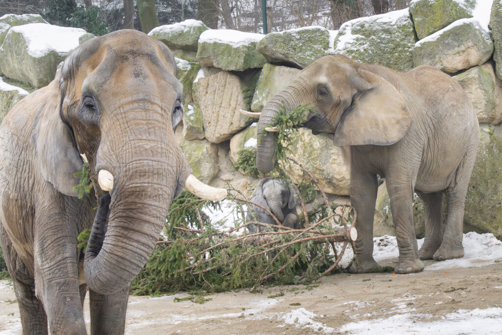 Wo vor kurzem noch tausende Lichter glänzten, glänzen jetzt Elefantenaugen: Die traditionelle Weihnachtsfichte vor dem Schloss Schönbrunn ist in den Tiergarten umgezogen. Der 160 Jahre alte Baum dient den Afrikanischen Elefanten nun als spannende Beschäftigung und natürlicher Knabberspaß.