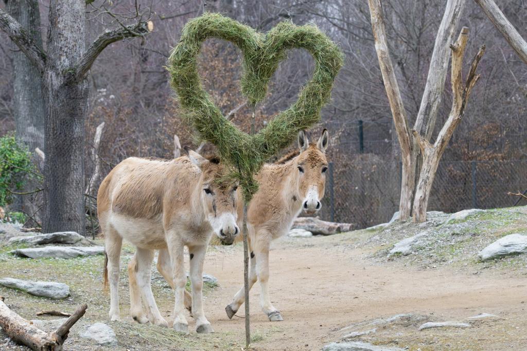 Im Herbst des vergangenen Jahres sind im Tiergarten erstmals Onager, eine Unterart des Asiatischen Wildesels, eingezogen. Von Monogamie ist bei ihnen allerdings keine Spur. „Onager leben in sogenannten Haremsverbänden. Unsere kleine Zuchtgruppe besteht aus drei Stuten und einem Hengst. Die Tierart ist von der Ausrottung bedroht und kommt nur noch in einem Schutzgebiet im südlichen Iran vor. Wir hoffen, im Rahmen des Erhaltungszuchtprogramms künftig einen wichtigen Beitrag zu ihrem Erhalt leisten zu können“, erklärt Kurator Rupert Kainradl, MSc. Ein Hauch von Valentinstagsromantik hielt bei den genügsamen Steppenbewohnern bereits Einzug – mit einem Herz aus Heu. Die Pflanzenfresser, die sich vor allem von harten Gräsern und Kräutern ernähren, haben die Überraschung prompt verdrückt.