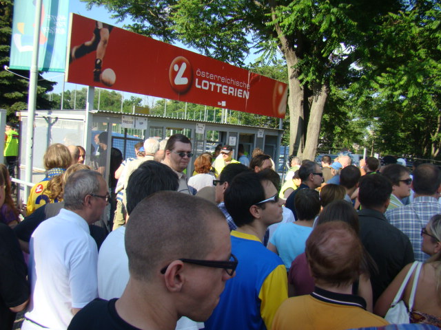 Endlich EinlassSehr viel an Brisanz lag also über dem geschichtsträchtigen Areal der Hohen Warte und so zog es viele Freunde des runden Leder, sowie Aktive von einst – Hans Buzek, Herbert Feuer, Herbert Prohaska … und jetzt – Hannes Aigner, Christian Schicker … und sage und schreibe 5.500 Besucher zu diesem Bundesligaspiel. Eine Kulisse, die einem Traditionsverein wie der Vienna mehr als nur gerecht ist. Zu den vielen Südstadt-Pilgern der Admira gesellten sich auch einige Anhänger des Wiener Sportklub und des FC Blau-Weiß Linz ins weite Rund der Arena. Und da dem Dargebotenen am Rasen zwar Beachtung geschenkt wurde, ob der fehlenden Rasse-Szenen aber mehr und mehr der Glaube fehlte, dass torschussmäßig etwas verpasst werden könnte, widmeten sich die neutralen Beobachter picknickähnlichen Zuständen auf den alten Stehterrassen und den langen Warteschlangen entlang der beiden Erfrischungs-Ausschänke.