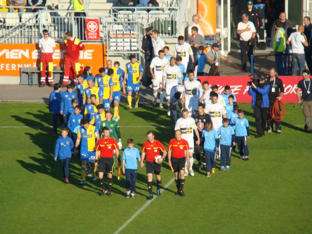 Altach hielt abwartend dagegen, war jedoch stets brandgefährlich. Nach 16 Spielminuten beispielsweise donnerte der Vorarlberger Matthias Koch den Ball an die Querlatte. Abwartend und fast zaghaft ging es weiter, ehe knapp vor dem Pausenpfiff lauter Jubel durch das weite Rund schallte. In der 43. Minute gelang Philipp Hosiner die Führung für die Heimischen. Sein Tor war wunderherrlich anzusehen, dafür lohnt es sich, auf den Fußballplatz zu gehen. Patrick Kienzl verlängerte den Ball in den Strafraum, besagter Hosiner übernahm volley und scorte unhaltbar für Martin Kobras zum 1 : 0. Ein traumhaftes Tor. Mit dieser Führung ging es in die Kabinen.