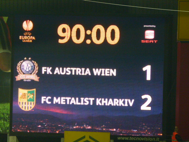 Willkommen zum SpielDie Ukrainer, ganz in Gelb gewandet, hatten Anstoß und übernahmen vom Anpfiff weg das Kommando. Veilchen-Coach Karl Daxbacher warnte nicht umsonst vor der auswärtigen Spielstärke dieser Mannschaft, umso mehr, da eine Vielzahl aus fußballerischen Fremdarbeitern – gestern standen fünf Argentinier, drei Brasilianer, ein Senegalese und lediglich zwei Ukrainer in der Startaufstellung – für Metalist aktiv sind. Und dennoch gelang den Violetten die Führung. Mit dem ersten gut vorgetragenen Spielzug nach 7 Minuten stand des plötzlich 1 : 0. Nacer Barazite flankte von rechts auf Roland Linz, dessen abprallender Kopfball vor den Beinen von Tomas Jun landete. Der Tscheche fackelte nicht lange und traf trocken zur Austria-Führung. Eine Novität, war dies doch das erste Gegentor gegen Metalist im laufenden europäischen Bewerb.